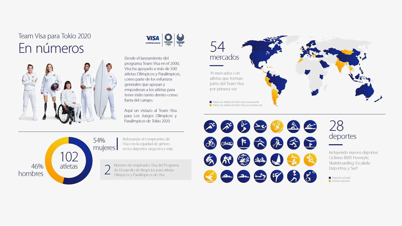 - 56 mujeres, 46 hombres, reforzando el compromiso de Visa con la equidad de género en los deportes, negocios y más