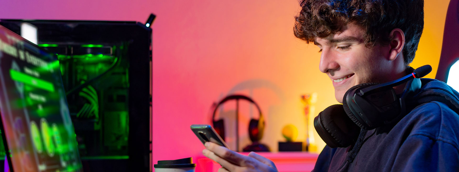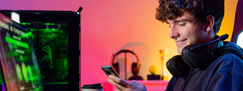 Chico gen z con el teléfono en mano Chico gen z sonriendo con el teléfono en mano