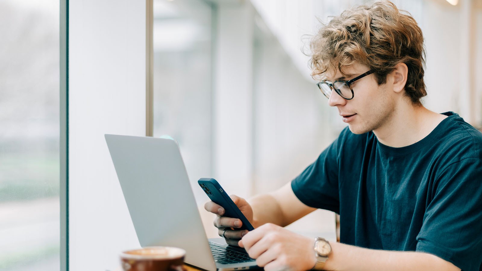 Hombre usando su celular y computadora Hombre usando su celular y computadora